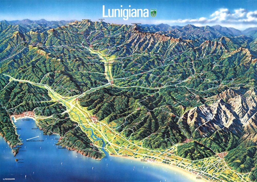 Lunigiana-området er omkranset af "grå" bjerge, helt op i 2000 m højde. Nord-østligt ligger appeninerne og syd-østligt domineres horisonten af bjergene i naturparken Alpi Apuane.